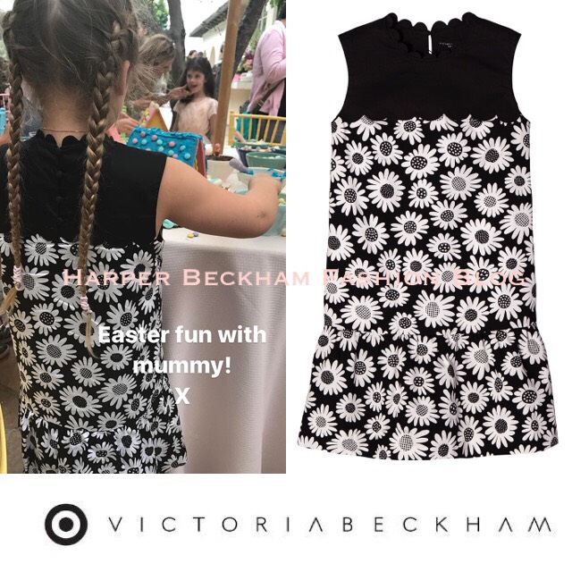 Harper was wearing Daisy Print Black Scallop Trim Dress from Victoria Beckham for Target Collection. (on sale, and some sizes are still available at the time of this post).