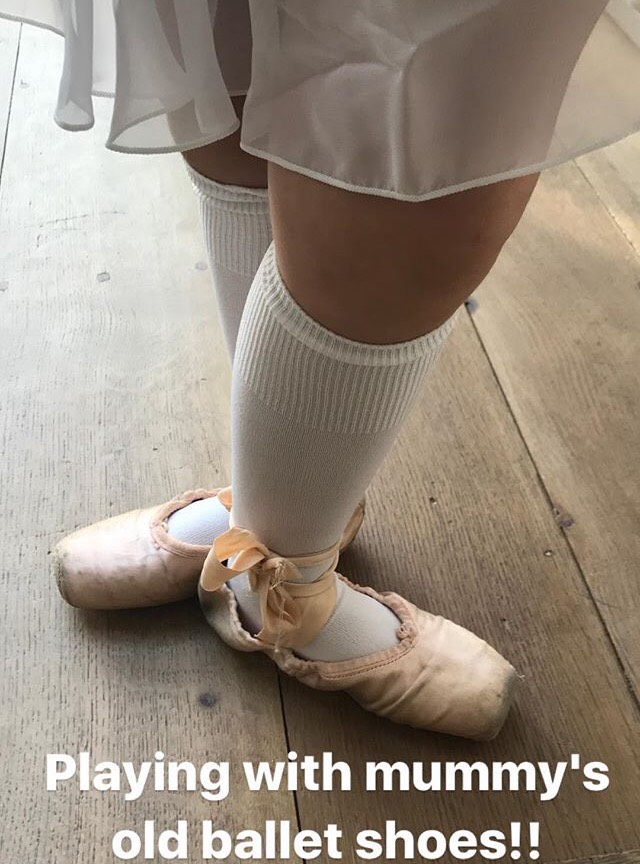 and Harper wearing VB's old pointe shoes, while at grandmother's house.